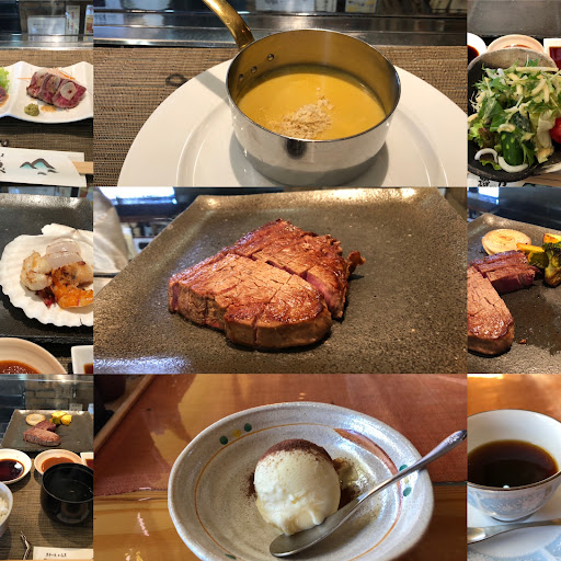 最初に前菜の三種のお肉が出てきて、前菜とは思えないクオリティです。 次にポタージュスープこれも濃厚で美味しい。 次にサラダが出てきましたが、新鮮で美味しい。 次は焼き物でホタテ貝とエビ🦐です。 焼き加減も良くて美味しい。 このあたりでお腹が一杯になってきますが、メインのお肉です。 サーロインかヒレどちらか選べて100gのヒレにしました。 焼き方は動画を見て下さい。 口の中に入れたら、噛まずともとろけていきそうなくらいに柔らかくて美味しい。 後は、ご飯と吸物、デザート、飲み物が付きます。
