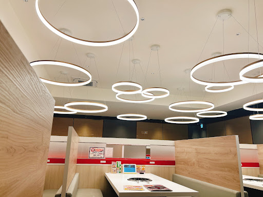 案内されたのは6人が余裕で座れそうなテーブル席。お一人様だったのですが、これだけのキャパがあれば一人でも 恐縮することはないようです。そうそう、天井の円形の照明もお洒落でファミレスのような佇まい。