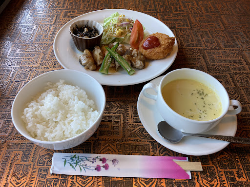 静岡県湖西市の新所原駅南口から南に進んだ突き当たりの県道3号線アメニティ通りを、ずーっと東に進むとある喫茶店です。できてから結構経っていて建物内外年季入ってます。看板の店名がわかりにくかったりしますが、周りの景色に馴染んでるとは言えないたたずまいなのでわかるかと思います。フロアはそこそこの広さで、カウンター、テーブル席があります。店内はやや暗いです。今回は入って左手奥のテーブル席です。テーブル、椅子共にやや低いです。テーブルはあまり大きくないもので、天板のデザインがにぎやかです。店内BGMはオルゴールアレンジの曲がかかっていてとても落ち着いた雰囲気です。ほぼお昼時でしたが、雨が降っていたこともあってか空いていました。注文は口頭で、今回注文したのはランチのプレートセットでこの日はポークカツカレーにサラダにデザート、アフターケーキにストロベリーケーキ、コーヒーはブレンドをホットで、更にストロベリーミルクジュースです。フォークやスプーンは小ぶりなものです。駐車場はわりと広く感じます...