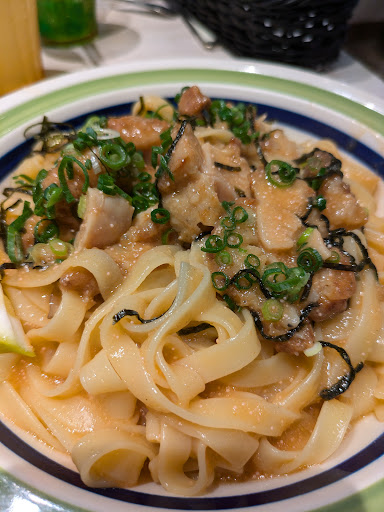 さて、メインのパスタについてですが、パスタの味を選んだ後に麺の種類が3種類から選べます。 手作りパスタというだけあり、どれも美味しそうに思いましたが、いつもあまり食べないフィットチーネパスタを選びました。 18時頃入店し、直ぐに席でタッチパネルで注文しましたが、メインのパスタが提供されたのは約30分後で、少し店内のスタッフさんの数と客数に対して時間がかかっているのでは?と疑問に思いましたがバイキングも楽しんでいたので良しとします。 しかし、パスタの味が麺とソースがマッチしてないのか、私の口にはイマイチ合いませんでした。 注文したのは唐揚げと明太子のパスタです。 決して不味いわけではないのですが、不思議な味で、味変にレモンもかけたのですがむしろたべにくくなってしまった気がします。