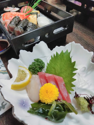 静岡県湖西市の県道332号線豊橋湖西線、新所原駅前信号交差点を東に行った1つ目の信号を北にしばらく進むとある、お寿司や海鮮料理がメインのお店です。建物内外和風とはいきませんが、出来てから結構経っていて調度品など年季入ってます。お昼時には少し早い時間でしたので比較的空いていました。入口入って程なく手指消毒用のスプレーボトルがあります。席はカウンター席が数人分とテーブル席がいくつかありました。お座敷もあるようです。今回はテーブル席に案内されました。履き物は脱いであがるスタイルです。注文は口頭で、今回注文したのは少しずついろいろな種類の料理が楽しめる松花堂会席、マグロのとろ串焼きです。お寿司は価格によって内容が変わるようです。はじめに提供されたお茶は急須ごと置いて行って、あったかいものでしたが一杯目から自分で注ぐようになってました。料理はおおむねオーソドックスな味付けに感じました。マグロのとろ串焼きは自分には味が濃い目に感じました。接客は価格帯を考えますと最近訪れたちょっとお高いお店の水準には遠く及ばないものですが、不満が出るほどではありません。駐車場はそこそこあります...