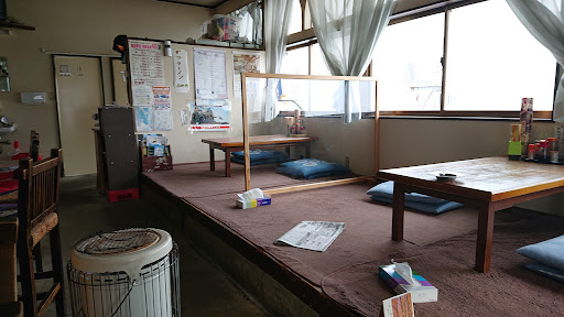 充分に広い駐車場にも車はない。 ネットでの営業時間とは違うが、のれんを信じてINしてみると案の定やっているとのこと。 早速薄ら寒く暗い店内に入るとおばちゃんが出て来てストーブに火を入れてくれる。 厨房にはとろ火の上に1つだけ鍋が乗り、他には何かを作っている気配はない。
