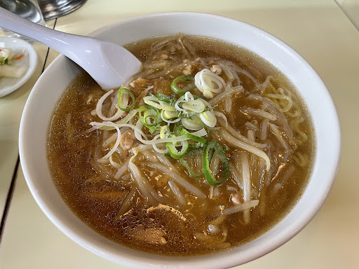 Read more評価が高かったので来店。 営業先からちょっと離れるけどね。 店の立て看板に「もやしそば」とあったので注文。それだけだと寂しいのでライスも追加。 店の雰囲気は昭和です。良い意味で。 老夫婦とアルバイトのおばちゃんでやつてました。 コロナの中である為かもしれないけど、絶妙な阿吽の呼吸でサッサッと仕事をこなすのは見ていて気持ちの良いものですね。 もやしそばですが、もやしと粗挽き豚ひき肉の餡掛けラーメンです。 餡は甘辛、ラーメンは昭和味のしょっぱ目でウマイよ。餡をご飯に載せてもイイね。 ご飯はどんぶり飯なので食べれる人に。 付いてくるお新香がニンニクぽい?かな。 餃子の荒切り?でもなんだかウマイ。