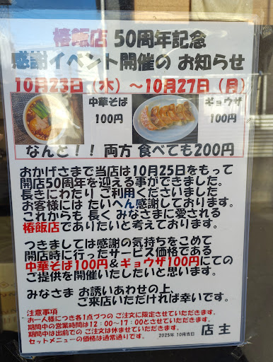 2025年10月25日に50周年を迎えるので2025年10月23日~27日の期間中は1来店ごとに1点づつの注文に限定されていますが、中華そばとギョウザが各100円で提供されるそうです。 開催期間中の営業時間は12時~17時に短縮されて出前も行われないようです。 他のメニューは通常料金みたいです。