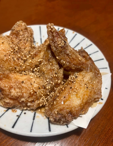 ◎ 手羽先(5本) ¥968 甘辛いタレと黒胡椒によるパンチの効いた味付けの手羽先。お酒や炭水化物の肴としてかなり良い。
