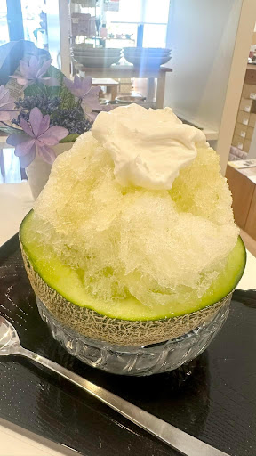 クインシーメロンを器にして、その上に盛られるメロンのかき氷。