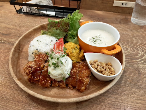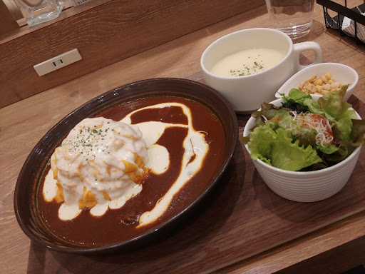 Read moreオムライスが食べたくてマップで越谷駅付近のオムライス屋さんを探したらありました。 越谷駅東口駅前、越谷ツインシティAの2階。オシャレなカフェ。 電源コンセントとキッズスペースもありました。お子さん連れにもいいですね。 オムチーズカレーのBセット(サラダ&スープ)を注文。 接客のお姉さん、とても愛想が良くて好印象。笑顔も素敵です。 10分ほどで運ばれてきたものはなんともオシャレ! 3種類の中から選べるスープ、今回はとうもろこしの豆乳グラノーラスープ。 サラダは新鮮、みずみずしく酸味の効いたドレッシングが相性抜群! グラノーラをポタージュスープに入れるとグラノーラの甘味が効いて美味しい~♪ 爽やかなコーンポタージュは絶品です。 メインのオムチーズカレーもこれまたビューティフル。 かなり濃い味のチーズソース、濃厚なそれが少し甘めなカレールーとベストマッチ。 カレー自体はとてもシンプルで甘め、お子様でも食べられるかも!だけど食べ続けるに連れてしっかりとスパイスが!ちょっとだけピリ辛だけどお子様でも大丈夫かな? オムライスのご飯には豆が!雑穀米?なのだろうか?ケチャップライスではないのはカレーだからか。 白いご飯にふわりと乗った半熟とろとろの黄色いたまごが美味! チーズソース、カレールー、たまごが相まって幸せなハーモニーを奏でる! 男性にも女性にもオススメな大人のオシャレなお店です! 一度は訪れないと損ですよ! 店内にはカウンター席の他にテーブル席もあります。 少人数でも大丈夫!ランチメニューはお得そうだ、次はパスタも食べてみたい。