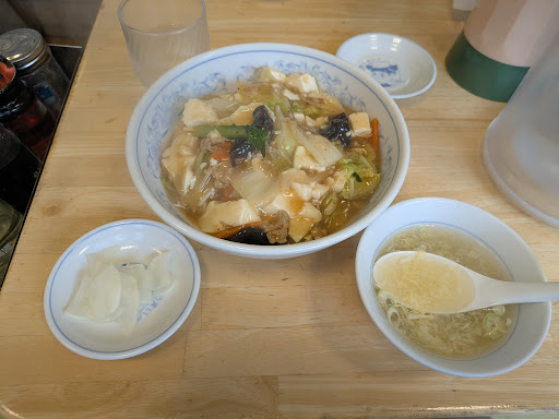 Read moreついに…キタ━(゚∀゚)━! 初めての満州…😭家族で私だけ…来てない… 嫁と2人…土曜日の11:20… オォ(˙꒫˙ )…8割程埋まってる… 思ったよりも小さい…(´-ω-`)ふーん..... ファミレスイメージだったけど… ちっちゃい吉野家みたい… 入口脇に冷凍庫があって… お持ち帰りもそのまま対応…(´-ω-`)ふーん.... 席は…2人掛けのテーブルが5~6… 奥に4人がけが1席… 後はカウンターが6くらい… 平均年齢高め…アダルトなお店… なんか…新鮮…さて…オーダーは… QRコードからの…携帯で…(´-ω-`)ふーん..... (アダルトな方は店員さんに直接してた…) もう…決まってます…(ΦωΦ)フフフ・・ やみつき丼と餃子セット…٩( 'ω' )و 嫁は…期間限定かな…茄子味噌炒め🍆定食… 1200円って…ちょっと高いと思ったら… 餃子🥟付き…((゚д゚)マジカ ボリューム問題無し(๑•̀ㅂ•́)و✧ テーブル狭いけど…乗るかな… 餃子があるから…すぐには出てこず… でもそんなに待たずに… やみつき丼セットから…着丼…⸜(˙꒳˙)⸝ 中華丼と比べて…ややピリ辛ですが… 辛いのダメな人でもいける程度… 食欲そそるピリ辛さ…Ψ( 'ч' ♡)ŧ‹"ŧ‹"ŧ‹"ŧ‹" 🥟は焼き目パリパリで…熱々…( ꒪Д꒪)ヤバ 当然美味しい…Ψ( 'ч' ♡)ŧ‹"ŧ‹"ŧ‹"ŧ‹" 350円のお値段も…いい😁✨ でも…1番は…🍆…( ੭˙꒳ ˙)੭ 香ばしい…熱々で…旨い( ゚д゚)ンマッ! 炒め物美味しいと…嬉しい⸜(˙꒳˙)⸝ 本当は…もう少し…価格に期待してた… でも…このご時世だし…(´ー`)ウンウン 🍚の盛りも良かったし…(´ー`)ウンウン ゴチソ━(人 -᷄ ᴗ -᷅...