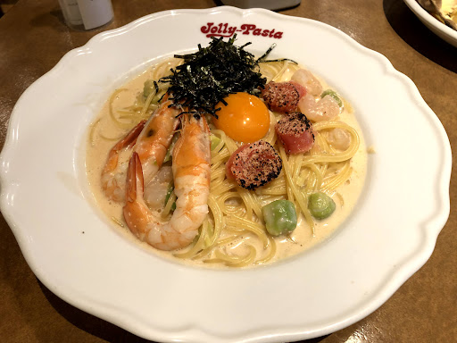 旅行から来るまで帰ってくる途中で コロナの影響でどこも夜やっている お店がなくどうしようもなく お腹が空いて、空いているお店で良いので と探していると ファミレスが一軒やっているではないか すぐに駐車場に入り 営業時間を確認すると 全然問題なし よくよく考えてみると ジョリーパスタは20歳の頃に付き合っていた 彼女が高島平のジョリーパスタに行ったっきり かれこれ20年ぶり? ニンニク強めのイメージしか無いが 久々のジョリーパスタどうなんだろうと 思い切って イカ墨パスタとタラコと 海老アボガドのカルボナーラ ピザドリンクバーセットを注文 自分は車の運転なので 連れは白ワインをチョイス 待つこと10分 ピザが到着!お!クリスピー系ピザ 美味いじゃん 焼きたてのピザ これはレンジでチンでは無いね 意外な美味しさにパスタも期待が上がる イカ墨パスタとカルボナーラが到着 先ずはイカ墨パスタ 美味い!え?ファミレスってこんなに美味いの? カルボナーラも美味しいじゃん! うわー!運転じゃ無ければ ワインが飲みたかった、絶対にワインに合う また、来ます! ご馳走様で...