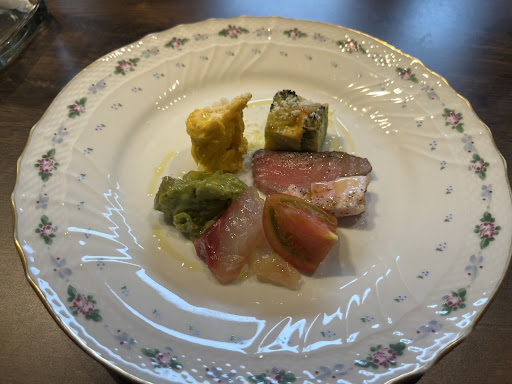団体利用で、二階の部屋を利用。今回は我々以外他に利用客はなく、隠れ家感があり、落ち着いて会合ができた。 梅ジュースソーダ割り。 梅の香りが強く、ソーダで割っても濃厚な甘み。最後まで美味しく飲める。 ソフトドリンクも、こだわりのセレクトと思われる。 前菜盛り合わせ。 肉がジューシー。アボガドやカボチャ、ブロッコリーの味も強い。 ピザ。大人数で利用のためサービス。生地の小麦の香りが強く美味。 パスタ。あっさりした口当たりだが、ウニとカニの濃厚な旨みがあとからくる。 メイン。ひらめのソテーと牛の赤ワイン煮込み(サービスで、肉と魚両方が楽しめるようにしてくれた) 魚は白身の旨みが強い。柔らかく、ジューシー。 肉もほろほろとほぐれる。肉の繊維の奥から、肉の旨みとソースの旨みの絡まった肉汁が溢れ出す。 ニョッキとカブ、ゴボウ、マッシュルームが添えられているが、野菜はそれぞれの素材の味が強い。 デザートに、クレームブリュレ。あと、コーヒーと紅茶。カリカリのカラメルを割るのが楽しい。 全体に、素材の旨みを壊さない味付けで、確かに厳選された材料を使っているのが伝わる。 店員も接客に笑顔を心がけており、配膳にも細かな配慮があり、好感がもてた。