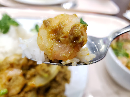 ◎クンパッポンカリー 海老の卵カレー炒め すべてのご飯ゎタイ米になります スパイス香るカレーゎご飯が進む~ 海老ゎプリプリ♪タマネギゎシャキシャキ食感も残っていて良いですね 残念だったのゎご飯の水分が多くパラパラしてなかった事かな 日本人受けゎするのかも知れないけどタイ料理にゎやっぱりパラパラとした米の方が断然美味いんだよね