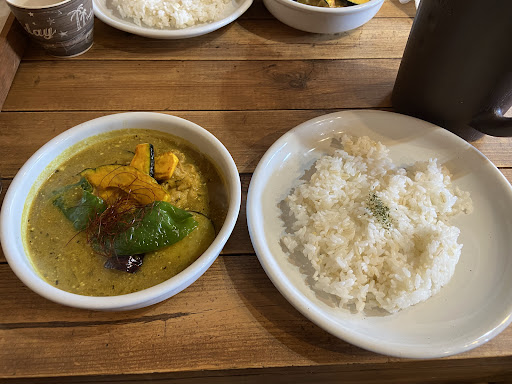 フレンチドレッシングのサラダつきです。 カレーの具材は玉ねぎ、カボチャ、パプリカ、ピーマン、ニンジン、ナス、チキン。 白米にはパセリがかかっております。 これらの具材が細かくカットしてあります。 ピリ辛で黄色いスープはどんどん食が進みます。