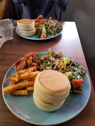 ランチタイムのパンケーキランチをオーダーしました。 パンケーキはふるふるで美味しそう…でしたが、生焼けのようなふるしゅわ感で表面は焼き色がついていて軽いさくっと感なのですが、側面がべたついていました。 こういうもんなのかな…。 パンケーキのお味は『ブランチスタイル』とのことで、ソース等はなくほんのり甘い…のですが、私には中途半端なぼやけた味に感じました。 フライドチキンは食べやすい大きさ…ですが、こちらもスパイスを感じられず、ソース(その日は和風おろしだったかな?)のかかった唐揚げって感じでした。 付け合わせのポテトは…うーん…チキンの味が移っているような…。 サラダはリーフレタスがたっぷりで普通にドレッシングがかっていて、普通に美味しかったです。 私は好みではなかったですけど、好みは人それぞれなので、一度食べてみてはいかがでしょうか。