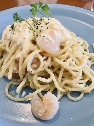 愛知県幸田町にある「スパ21」でランチ。 もちもち食感の生パスタが自慢の店で、 特にクリーム系メニューが秀逸。 中でも「雪の妖精」は、 ぷりぷりの海老と濃厚なクリームソースが 絶妙に絡み合う一皿で、 見た目も味も満足度抜群。 青いプレートに盛られた白いソースと 海鮮のコントラストが美しく、写真映えも◎。 カルボナーラ系は種類が豊富で、 「ふわふわ」シリーズなど ユニークなネーミングも楽しい。 ピザもテイクアウト可能で、 地元で気軽に本格イタリアンが楽しめるのが 嬉しいポイント。 落ち着いた雰囲気の中で、 ちょっと贅沢な昼食を味わえる おすすめスポットです。