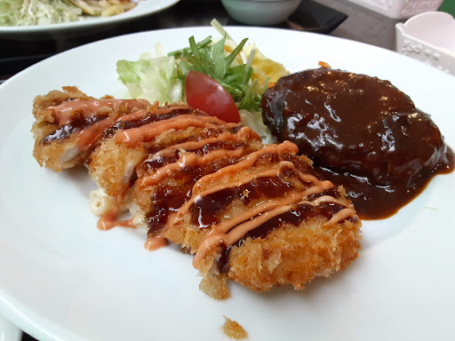 この日の日替わりセットは、ポークカツ&煮込みハンバーグ(ライス、スープ、サラダ付き)の欲張りセット!飲めるんじゃないか?ってぐらい柔らかいハンバーグの下にスパゲティ、サクサク食感にソースがからまってたまらぬ味わいのポークカツの下にマカロニサラダがいい味していましたよ。ちょっと、やわらかめのご飯だったけど、お腹いっぱいごちそうさまでした。
