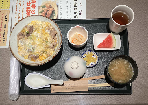 Read more夏なのに日替りがカキフライだったので、牡蠣の苦手な自分は、牛玉子とじ丼を選択。 +220円で小鉢、茶碗蒸し、果物が付くとのことでお得感ありで注文しましたが、日替わり(836円)のそれと同じで、やられた感がありました。玉子とじ丼は薄味でもの足らなかった。茶碗蒸しも小鉢も超小さいので日替わりの物と大きさ...
