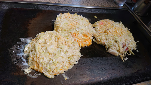 【地元人気店】 ■利用時の状況 ・日曜日の11時の開店と同時に1名で利用。 ・開店前から駐車場で待っていたが、その他は3名程度で、行列ができるほどではなかった。ただ、後から常連と思われる方が数名来店されていた。 ■注文内容 ・濃厚炙りチーズマヨネーズ焼 1,150円 ・トッピング(そば120円、もち130円、明太子150円、ねぎかけ150円、シーチキン130円) 680円 税込合計1,830円税込 →1,990円税込???(サービス料追加?) ■店内の様子 ・2人がけ2席、4人がけ5席、座敷4人座り2席、奥にも席がありそう。 ・5人くらいでまわしているのかな。 ・メニューを持ってきてくれて、注文したら回収される。 ・現金支払いのみ ■場所、アクセス、駐車場 最寄り駅からは歩いて1分程度。駐車場は4台くらいかな。 ★感想 〇味:よくばってトッピングをいろいろしたので味がごちゃまぜで正直失敗した🤣これは店のせいではなく、味の方向性を定めてないこちらのミス😝各テーブルの鉄板で焼いて熱々のまま鰹節をかけて食べられるのでコクが出ておいしい😋 ただ、明太子はただのソースをかけただけなので味、値段共にハズレ🥲ねぎかけとチーズも、もっと惜しみなく豪快にのせてほしいところ😩これだけトッピングしたので「おお、すごい量と迫力!!」となるかと期待したが、そうでもなかった😭 〇量:デフォルトなら普通。この値段のトッピングなら少ない(少し足して他の1品を頼んだほうがいい)。 〇コスパ:注文はデフォルトでするべき。トッピングは麺だけでいいと思う。他は割に合わない。 〇提供時間:焼き時間があるので10分程度 〇接客:普通 〇その他:大阪焼き風で、最初に目の前の鉄板に、混ぜてある具材🥣を広げて置いて放置😳片面が焼けたころに再度来て裏返し放置😳焼けた頃に来て、ソースかけてトッピングのせて最後にマヨネーズで仕上げ、「どうぞー」と言って去っていくスタイル😅店では最近広島風しか食べたことがなく、正直初めての感覚で、ある意味新鮮でした😉焼き方にこだわるといった手法ではなく基本放置。この形式で他のテーブルも回っていた。