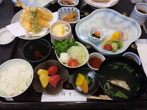 Read more平日昼利用。 駐車場は少し離れた場所に広く確保されていますが、看板が小さく見つけにくかったです。 お店の入口も小さく看板もないです。 スタッフの方は皆さん親切で丁寧に対応頂けます。 店内は広く、テーブル席とお座敷があります。 事前に予約し鮃の薄造り定食を食べました。 お料理はすべて丁寧に作られておりとても美味しかったです。 鮃は身に旨味があり、薄造りの量も多く満足できます。 天ぷらの衣は繊細でサクサクしていました。 お吸い物や茶碗蒸しもとても美味しかったです。このボリュームと美味しさならとてもリーズナブルだと思いました。 またぜ...