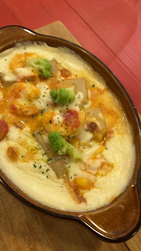 ぷり海老と胡麻豆腐のグラタン グラタンなので当然ですが熱い。 チーズと胡麻豆腐が思いのほか相性が良い。とろけるチーズととろける胡麻豆腐の一体感が素晴らしい。 チーズの濃厚さよりも爽やかさが後口に残る。なんだろう?チーズに工夫がある気がする。 グラタンは追加料金でドリアにも変更可能。