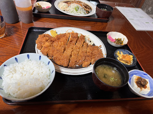 しばらくするとご飯が届きました。ひれカツは肉厚でサクサク衣。お刺身は高級なお魚ではありませんが海の近くなのでとても良いものです。