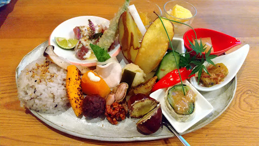 料理の写真を見て、お野菜がたくさん食べれて良さそうなお店だったので、行ってみたいとずっと思っていたお店です。 初めての訪問でしたが、11時半開店で、10分ほど過ぎた時間に着きました。駐車場がお店の敷地内に5台ほどしか置けなくて、まだ空きがあったので止めることができましたが、ここ以外には駐車場はないそうです。 予約のお客さんばかりのようで、知らずに突然来てしまった私達は無理かと思ったのですが、お席が1席だけ空いているとのことで、運良く食べれることになりました。その後来たお客さんたちはお席がいっぱいで、時間をずらして再来する予定にしたお客さんや、今回は諦めて帰られたお客さんもいましたので、必ずしも予約でなければ入れないわけではなさそうですが、予約をしたほうが良いです。 入り口でパンも売られていて、お食事と一緒にいただくこともできるようです。お食事を待っている間、次々と焼き立てパンが出来上がっていて、パンだけ購入しに来るお客さんもいました。私達は帰りに買って帰りました! お食事はプレートになっていて、メインは野菜の天ぷらかお魚で選ぶようになっています。今回一つずつ注文しました。このプレートには他にサラダとスープが付いてきて、スープもこだわって作られています。ご飯は雑穀米か玄米で選びます。 野菜の天ぷらはおくらとお麩と梨の天ぷらという珍しいもので、抹茶塩でいただきます。魚はぶりのカルパッチョでした。その他のおかずはどちらも同じものだそうです。たくさんあって、一つ一つ店員さんが説明してくれます。ありすぎて食べながら忘れてしまいましたが^^; どれも自分では作れないもので、ちょっとずつ食べるから楽しい💓今は秋なので、さつまいもやかぼちゃや栗といった秋の食材が多かったでしょうか。秋らしくてほっこり美味しかったです。季節ごとに違う料理が食べられるのかな?とまた次来たときが楽しみに思えます。お腹も満たされましたが、体に良さそうなものばかりですし、色とりどりで目でも楽しめて良いお食事でした。 セットにはドリンクだけのセットとドリンクとデザートのセットがあったので、デザートのセットをいただきました。今の時期は青みかんと豆腐のタルトです。デザート美味しすぎました!このくらいのサイズ感がちょうどよいです。美味しいからもうちょっと食べたいなというくらいでした。 飲み物は色んな種類から選べますが、アイスコーヒーにしました。酸味は強いですが、苦味はなく、サラッと飲めました。ミルクをつけたのですが、豆乳だそうです。
