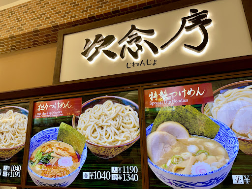 Read moreモラージュ菖蒲3階のフードコート内にあります 鴻巣の有名店、次念序 フードコート自体が、最近リニューアルして席を増やしたらしく、ほぼ並ぶ事もなく埼玉県屈指のつけ麺を頂けるのは、とても有り難い事です 初次念序なので、オーソドックスに つけ麺 大盛り を注文しました 15分程かかりますが、よろしいでしょうか❓ との事ですが、たった15分でこのラーメンを頂けるのかと思うと、かえって有り難いと思うばかりです さて、10分ほど自席で待つと、出来上がりのコールが鳴りました 早いですね いかにも濃厚な魚介のスープと器いっぱいの太麺 いかにも六厘舎のそれといったビジュアルです 麺は、全粒粉と言うのでしょうか、黒みがかった茶色をしていて、もちもちとした歯ごたえ、ツルツルとしたすすり心地、しっかりと感じられる小麦の甘み スープは、一見またこの味かと思わせますが、口に含むと、魚貝の旨味にほんのりとした上品な甘み、しっかりと出汁が効いていて、それでいて複雑ではない旨味に溢れています 明らかに、多くの材料で作られたスープなのに複雑ではないスマートに洗練された単純な旨味です この相反するスープ、単純に、美味しい ショッピング・モールのフードコートでこんなに美味しいつけ麺を頂けるとは、日本のフードコートのクオリティーの高さに脱帽です 美味しいつ...