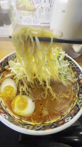 スープは濃厚 甘味は無くオイラ好み しかし器のお陰で少なく感じる 麺は……西山製麺にしては太い まぁ製麺のプロはどんな依頼も受けるから 頼めば作るよね ただ……出たよ この啜れない短い麺 食い難いなぁ チャーシュー野菜メンマ トッピングの味玉 パッとしない……旨味無しの完熟卵 濃厚味噌に完全に負けてる スープの邪魔しない具材だか 全て 負けている トッピング要らないな 箸でガバッと掴み一気に啜る事が出来ない 量は並でも多めの筈だが満足感低いなぁ チマチマ麺を探し イマイチ旨くもない野菜が邪魔者だな