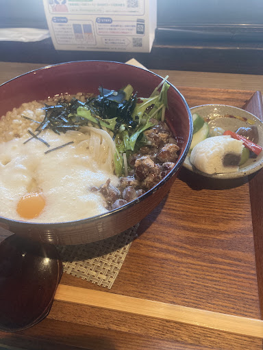 Read more久しぶりの訪問です🎵 ランチの豚肉丼ととろろのセット【男前】を注文❕ 麦飯の上に優しい味つけの豚肉がおおい、とろろをかけるとヘルシーでありながらパワフルな丼物になっています🎶美味いです。 お味噌汁やお通しも美味しかったです❕ (〃∇〃) コーヒー提供遅くなったとおまけ付き。 ありがとうございますm(_ _)m お土産に【ちーず大福】を購入。 冷していただく大福は、濃厚チーズの味・香りとマッチして美味しいです🎵 また、来ます🎵 ( ̄∇ ̄)