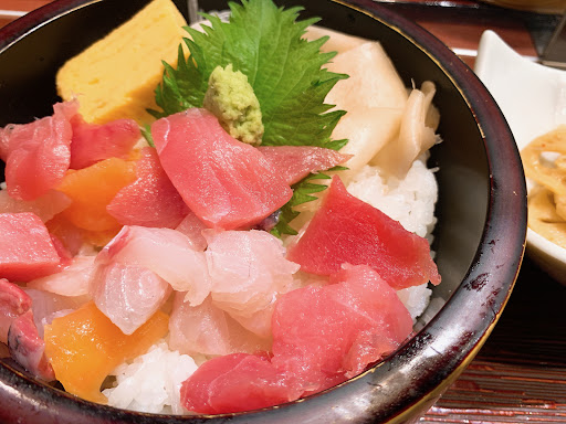 23年4月2日(日)11時45分:初訪問 日替わりランチ海鮮チラシ(1300円)PayPay可 テーブル席はほぼ満席、小上がりは後から団体がゾロゾロと。混んでます。4人席に座りましたが全て1人毎で仕切りがありコロナ対策がしっかりとされていますが、話しづらいです。日替わりのAセットは売り切れていて、Bセットを注文。 10分ほどで提供。刺身はバラ部分で、中トロは美味しかったです。盛りがもっとあると嬉しいですね。うどんは濃い醤油の汁にコシのしっかりしたうどんでした。最後にドリンクも付いています。 ごちそうさまでした^_^