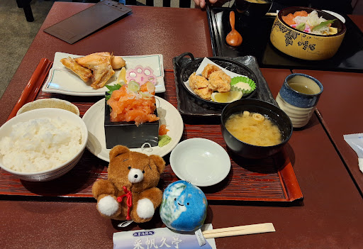 「デラックス熊さん定食」は 鮭のお刺身、焼き鮭、鮭の唐揚げに ごはん、お漬物、お味噌汁(こちらも中に鮭?が!これは丼物についてるお味噌汁と同じみたいです)と 1100円でこんなにたくさんよいの!?というボリュームでした。