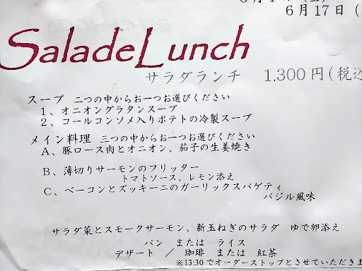 ⭐️スープはオニオングラタンスープとビシソワーズから1つチョイス。 ⭐️メインは豚ロースの生姜焼き、サーモンのフリッター、ベーコンとズッキーニのパスタから1つチョイス。 ⭐️サラダはスモークサーモンと新玉ねぎ ⭐️パン又はライス ⭐️デザートはアイスクリームとシャーベットとミニケーキプレートからチョイス ⭐️コーヒーか紅茶