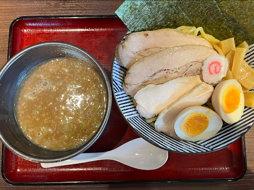 トッピング 豚バラチャーシューは、やや厚めで10センチほどの長さがある。炙った香ばしさが感じられる。やや繊維感が強いが柔らかく、食べづらさが気になるほどではない。つけ汁との相性も良い。 鶏チャーシューは、やや厚めで楕円形。しっとりとしていて食べやすいが、やや味付けが淡白で、つけ汁のパンチに負けている。胡椒の香りが特徴的。ハーブのような香りをうっすらと感じたが、つけ汁に隠れていてよくわからなかった。 煮卵は中まで火が通ったタイプ。こちらも味付けが淡白で、ただのゆで卵かと錯覚するほど。つけ汁のパンチに負けている。 メンマはやや繊維感があり、食感には良くも悪くもバラツキがある。こちらも味付けが弱い。 海苔は大判で香りが良いが、口溶けが妙に悪く、いつまでも口内に残る感じがあった。