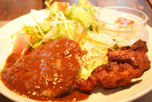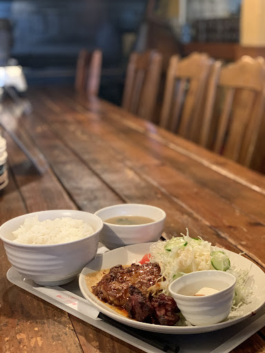 【内容】 ◯唐揚げとハンバーグ 大ぶりのハンバーグと唐揚げ2個に、大量の千切りキャベツとポテトサラダに冷奴とお皿の上にたっぷりのオカズとサラダと小鉢が乗ってます。 ハンバーグは、肉肉しくてソースは少し少なめですが、お肉に良く合う深みのあるソースです。 唐揚げは、下味がしっかりと付いておりこちらもご飯に良く合います。
