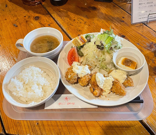 オーダー ・唐揚げとハンバーグ定食→700円 ・ご飯の大盛り→100円 ※価格は税込価格です。 ※お茶はセルフサービスです。