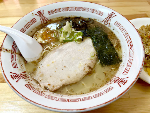 ⚫︎ラーメンは、伝統の熊本ラーメンです。 麺が中細ストレート麺で、コシがあり喉越しがよく程よくスープに絡む感じが最高です。 豚骨スープもニンニクチップがかけてあり、これぞ熊本ラーメン‼️ ただ、食べ進めると、少し塩味が強くて飲み干すことはできませんでした。 私的には、塩味を抑えて甘味を増したら、スープも飲み干せると思いました。 焼豚は、厚めのモモ肉でよく味が染みており美味しい。 ⚫︎半焼きめし 炒飯でなく焼きめしです。 具材は少ないですが、ラーメンにバッチリです👌