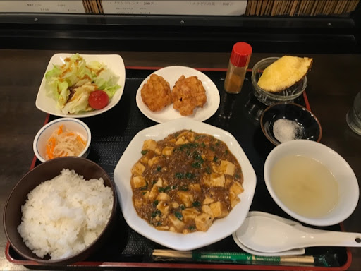 平日の19時半頃に初めて伺いました。 口コミで評価の高かった麻婆豆腐定食(750円)に唐揚げ2個付いた唐揚げセット(150円)を注文。 麻婆豆腐は基本の辛さが0で順に5まであるとの事でした(5辛を食べれた人には10でも20でも出来ますとの事でした(笑))。 辛いもの好きなので、この日は4辛をお願いしました(辛さが足りなければ追加で辛味調味料で調節出来ますとの説明あり)。 麻婆豆腐は日本人の口に合う、基本的な町中華で美味しく戴きましたが、個人的には四川風のもう少し花椒や山椒の痺れが効いた方が好みですね。 4辛はそこまで辛くはなく、5辛でも良かったです(笑)まあ辛ければ良いって訳じゃないですが・・(苦笑) お聞きしたところ、スコーピオンなど数種類の唐辛子は自家製で、独自にブレンドされていらっしゃるとの事でした。 セットの唐揚げは1個が大きめで、揚げたてアツアツ、衣はサクッとしていて肉はジューシーでとても美味しかったです。◯将みたいに塩をつけて戴くスタイルで、唐揚げ好きの私には最高でした。 定食にはスープとサラダと小鉢(この日は切干大根と人参の酢の物)とデザートとしてパイナップル1切れが付いてました。 メイン以外も美味しかったですね! この内容とボリュームで750円+150円=900円はコスパ最高です。 コロナ対策の為、カウンター2席とテーブル1つ、奥に座敷があるのみの小さなお店ですが、他の定食や麺類、焼飯なども食べてみたいと思えるお店でした。 ご馳走様でした。