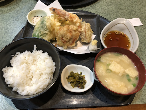 旦那が680円のMix天ぷら定食 わたくしは580円のコンビ定食の エビチリと油淋鶏 に決定👍