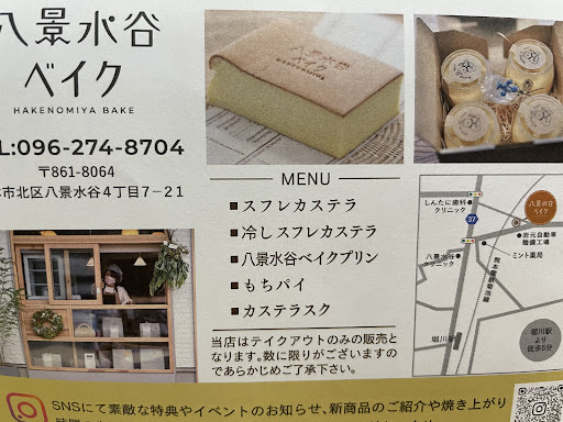 Read more熊本電鉄の八景水谷駅から取られているスフレケーキやプリン、焼きカステラが販売されています。小さな店舗で、駐車場は、店前に2台停める事が出来ます。とてもお洒落感じです。今回は店名の八景水谷ベイク(プレーン)を購入しました。残念ながら焼きたては売り切れており、冷凍されたものなら提供出来るとの事なので購入(1400円)しました。チョコレートは1500円との事なので、チョコレート好きには是非どうぞ。なお、冷凍なので、自然解凍で5〜6時間後が食べ頃とのことでしたので、ルールを守っていざ実食😁あー、とても柔らかく、甘さ控えめで優しいです✨美味しい。そして、大きいですね。値段もリーズナブルです。近くに来られた時には是非お立ち寄り下さ...