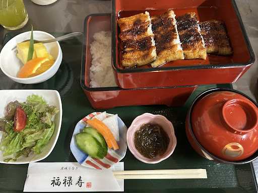 Read more鰻が食べたくなりネットで高評価の福禄寿さんに伺いました。熊本の鰻屋さんは初めてで11時開店に合わせての予約を取り15分前に到着で店舗前に2台と隣接のコンビニにも駐車可能みたいです。店内に入るとオーナーやスタッフが明るく元気に迎えてくれました。✨店内は香ばしい匂いが食欲を誘い鰻屋さんには珍しく静かなJAZZバラードが流れていました✨👌 早速うな重の中を2人分注文しました。素焼きにした鰻を蒸しあげて炭火で焼くという江戸前手法で、なんと100本近くの骨を手作業で抜きとるとの事で手間ひまかけて仕込みを行なってるんだと感心しました。✨ オーナーは200年前に創業の東京の老舗「野田岩」で修行しただけあり鰻に対してのこだわりは徹底した印象でした。✨ タレは関東風と九州風があり甘辛の九州を選びました。口に入れた瞬間に鰻の香ばしさと柔らかさとふわふわ食感が広がり旨さを超えて幸せ感がじわぁぁと溢れました✨有機栽培国産米も美味しかったです✨...