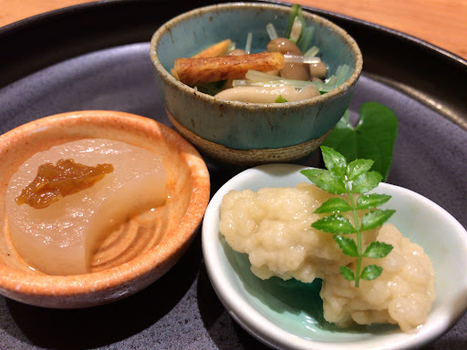 季節小鉢、鯛のお刺身をいただきながらメインのカツとじに期待が膨らみます♪
