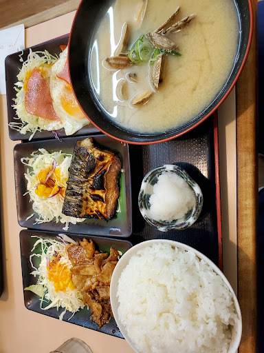 Read moreご飯🍚メニューの迷路入ってしまう定食屋さんです❗ 結局、迷った挙げ句に3品選べるデラックス定食(スタミナ焼きハーフ、塩サバ、ハムエッグ)を選択❗それに味噌汁を貝汁に変更したため➡️4品デラックス❓️ なかなかメニューの構成が難しく、孤独のグルメの松重さんみたいな状態😅 連れも迷いながら銀鶏(甘だれ)とバンバン(なんぞや❓️)と自分が選んだおかず達を待つ始末😅 3種のデラックス定食規則的におぼんの上に並んで、何かしらの品評会みたいですが 塩サバ➡️腹身で油が乗って普通に🌟4 ハムエッグ➡️卵の半熟具合が良く🌟4 スタミナ焼き➡️甘辛カレー味❓️もっとガッツリかと思いきや味にもの足りず🌟2 貝汁➡️貝の量、大きさは⭕ですが、汁がぬるめで🌟3 バンバンを一口➡️微妙な味付けで🌟2 この店は、おかずのチョイスしだいでは、🌟4でも🌟5にもなる楽しいお店です❗ バンバンの謎を店員さんに聞いてみると… 直腸(てっぽう)と言う部分なのでバンバンだそうで、豚の...