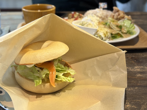 今回はスモークサーモンのベーグルサンドと大人さまランチ、食後にパンケーキを注文しました。 店内は私たち含め3人でしたが、おひとりで作られていたからか料理の提供までに30分ほどかかりました。 スモークサーモンが好きで楽しみにしていましたが、いざ食べてみるとサーモンスライスが1枚のみ…いくら軽食で物価高とはいえ、1枚だとサーモンの存在があまり感じられず残念でした😢 大人様ランチは唐揚げがいちばん美味しかったそうですが、全体を通して男性には物足りない量でした。 パンケーキは薄めで、フワフワ感はあまりないタイプです。食後には丁度いいサイズでした。