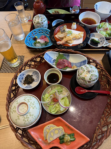 Wow, the food at this wonderful is absolutely delicious. We were very keen to try some local Kumamoto produce and this was very special. Upon arrival we were greeted so well, and shown to an area where we chose our own place to sit because it was empty at this time. (It filled up a bit after a while but not too busy). It’s a top quality restaurant, calm and relaxed, superb environment. Our waitress was so polite and attentive too! So, we had.. the Original Kamameshizenn, Aoyagi's Gomoku Kamameshi has 2 small bowls, sashimi, salad, seasonal mini tempura, chawanmushi, soup, pickled vegetables, homemade tyousenname. Kamameshi is flavored rice with ingredients from the mountains and sea cooked in an individual pot using local natural spring water. The recipe for the stockof Kamameshi has never left the premises und been kept a secret since the establishment of the restaurant. Each pot of rice is cooked to order. This fine meal is the signature dish of the Aoyagi restaurant, we loved it.