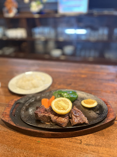 マスターが肉を焼いている音が聞こえる。 客が私しかいないので、私の肉が焼かれている。 その後、数十分後にマスター自ら料理を提供してくれた。 熱々の鉄板の上にステーキが乗せられているから、良い音を奏でて運ばれてきた。 この時も無言の提供で、愛想ゼロ笑 海外のお店に来た感覚に一瞬陥るが、料理が美味しければOK。