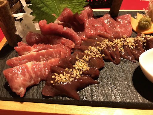 Horse sushi, horsemeat bowl & many other horse dishes, plus live fish ready for seafood dishes.