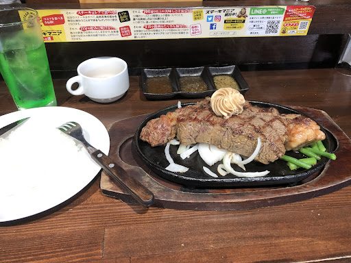 Read more食欲をソソる看板に目が行って👀 ずっと気になっていたので行ってきました🎶 駐車場は奥に広くなっているので、入口は狭いですが、混雑時間はそこまで止めにくいことは無さそうですが、出る時に少しタイミンク的に出ずらいです🙇♂️(交通量多い浜線道路) 複数回行かせていただいております💃🏽 少し前から値上がりし、ギリギリのコスパのお値段??になりつつありますが💡 誰しも…お肉が食べたい!と思った時、見た目のパンチ&150gで女性は充分お腹一杯にもなり、満たされるので、通い続けけております🤩お得なバリューランチで1300円ちょっと、メンズなら300gで1700円ちょい…肉のチョイスや、ハンバーグのセットで、お値段が変わる感じですが、値上がりしたとは言え見た目にお得感は残っております🙇♂️ 肝心なお肉ですが…複数回行くだけあって、当たり、ハズレが多い💦安定しないな💦というのは正直な所ですw(レアでもかたいと思う時や、スジばかりの時もたた有り…バリューでなくとも、他のお肉でも、ん〜🤔と) 肉の焼き加減はレアで来ますが(私はレア好きなので気にならず)焼き石?が付いてるので好みで焼き加減調整🎶 調味料のソースが…以前は工夫を凝らし、沢山の種類が至れり尽くせり🎶だったのですが…コロナも終わりかけた頃に…何故かソースの使用が変更になり、店員要らずで自分で取りに行くスタイルは変わらずですが、物凄く味気ないものに(逆に周りがベタベタした不衛生なボトル)どんどん変わっていくので、個人的には残念です🤢 人手不足?なのか…トイレの掃除や、清潔であるはずの清浄機も汚い事も多い🤢 値段をあげるのは世の中の流れですが、なら、細かい所、もぅ少し頑張って頂きたいです💦飲食店ですので😋 ですが、また行こうと思う店ではありますので、行かれたことない方は是非行って見て下さい🤗ドライ...