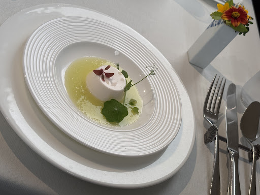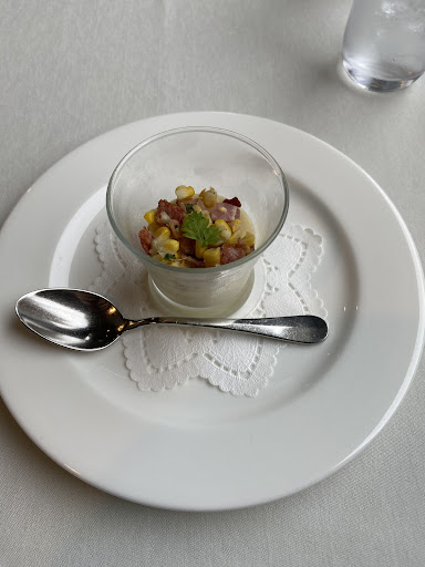 熊本産のとうもろこしのムース、蕎麦粉のガレット、ボルシチのサワークリーム乗せ、天然スズキのポアレ、牛フィレのステーキ、チョコドームのオレンジソースがけ、 スタッフの方が一品ずつ説明してくださったのですが、うろ覚えなので間違ってたらすいません。オレンジソースはシェフ自ら注いで下さって、チョコが溶けるの見られて楽しかったです。コーヒーも半分以下になったらスッとおかわりどうですか?と聞いてもらえます。