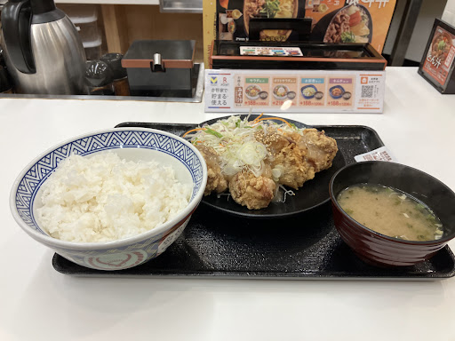 Read more最近は注文時に支払いまで済ませる「黒い吉野家」が増えつつありますが、こちらは従来からの食後に支払いを行うスタイルの店舗でドライブスルーも対応していません。 個人的に吉野家は唐揚げ屋と化していますが唐揚げは扱いのない店舗もある為、事前に扱っている店舗を調べた上で訪問しています。 この日はネギ塩唐揚げ定食をオーダー。 特にブレる事なく可はないが不可もない、安定したいつも通りの食事が頂けました。 定食メニューはご飯おかわり自由のため、安価に腹一杯になりたい際には重宝しています。 クレジットのタッチ決済未対応だったりとやはり黒い吉野家に比べ利便はイマイチでした。 店内は馬蹄形のカウンター10席とテーブル席が20席程度。 駐車場は敷地内に1...