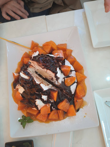 Chef is nice and gentle, explains patiently. Fluffy pancakes 🥞 covered ice-cream and lots of whipping cream, then fresh peache-puree and peache-cubes❤️ Small but very cozzy space to enjoy the coffee break with wonderful desert!