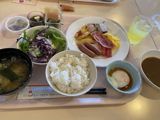 Start your morning at the resort hotel on Kume Island with a nutritious buffet. A rich lineup of Japanese and Western dishes includes Okinawan delicacies such as umi budou, jimmy tofu, and goya chanpuru (bitter melon stir-fry). For beverages, we recommend the refreshingly sweet Shikwasa Juice.